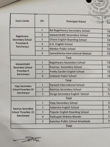 यता राष्ट्रिय माध्यामीक बिद्यालय, दुर्गा माध्यामीक इ. स्कुल र फारवेष्ट इण्टरनेशनल स्कुल गरी ३ बिद्यालयको परिक्षा केन्द्र श्री विजय माध्यामीक बिद्यालय भिम–विकासवस्ती पुनर्वास १० लाई तोकीएको छ । भने विजय माध्यामीक बिद्यालय, आदर्श इ. स्कुल, पपुलर इ. बो. स्कुल, पशुपती शिक्षा मन्दिर र कञ्चन पब्लिक स्कुल गरी ५ बिद्यालयको परिक्षा केन्द श्री राष्ट्रिय माध्यामीक बिद्यालय अमरवस्ती पुनर्वास ११ लाई तोकीएको छ ।