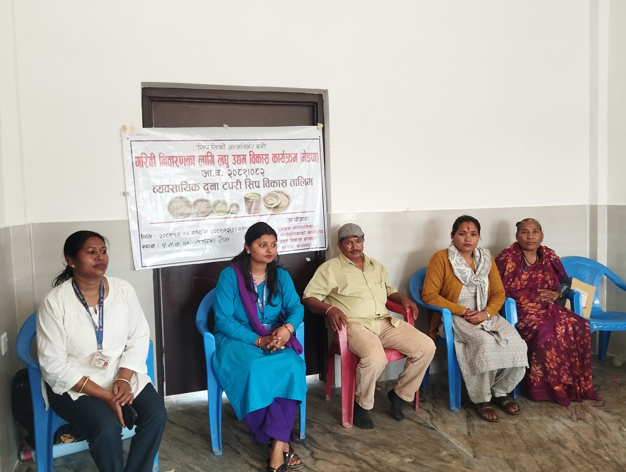 “सिप सिकौँ आत्मनिर्भर बनौँ” भन्ने मुल नाराका साथ पुनर्वास–११ भिमवस्तीमा ब्यवसायिक दुना टपरी सिप बिकास तालिम सुरु गरीएको छ । गरिबी निवारणका लागि लघु उद्यम बिकास कार्यक्रम अन्तरगत पुनर्वासको उद्यम बिकास शाखाको आयोजनामा दुना टपरी बनाउने तालिम सुरु भएको हो ।
