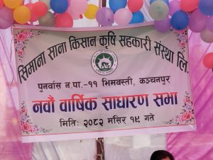 कञ्चनपुरको पुनर्वास ११ भिमबस्तिमा रहेको सिमाना साना किसान कृषि सहकारी संस्थाको ९ औँ वार्षिक साधारणसभा सम्पन्न भएको छ । शुक्रबार एक कार्यक्रमका बीच संस्थाको निर्माणाधीन भवनमा देवकी सापकोटाको अध्यक्षता र पुनर्वास नगरपालिका वार्ड नम्वर ११ का वडाध्यक्ष तुलसी अर्यालको प्रमुख आतिथ्यतामा नवौं वार्षिक साधारण सभा सम्पन्न भएको हो ।
