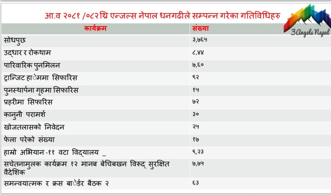 कार्यक्रममा थ्री एन्जल्स नेपालको शाखा कार्यालय धनगढीले आर्थिक वर्ष २०८१/०८२ मा उल्लेखनीय कार्य गरेको जनाएको छ । शाखाको प्रतिवेदन प्रस्तुत गर्दै मानव बेचबिखन विरुद्धको कार्यक्रम प्रबन्धक ममीला गुरुङले एक वर्षको अवधिमा संस्थाले ३,७६५ जनासँग सोधपुछ गरेको छ भने ८४४ जनालाई उद्धार र रोकथाम गरेको उहाँले जानकारी दिनुभयो ।