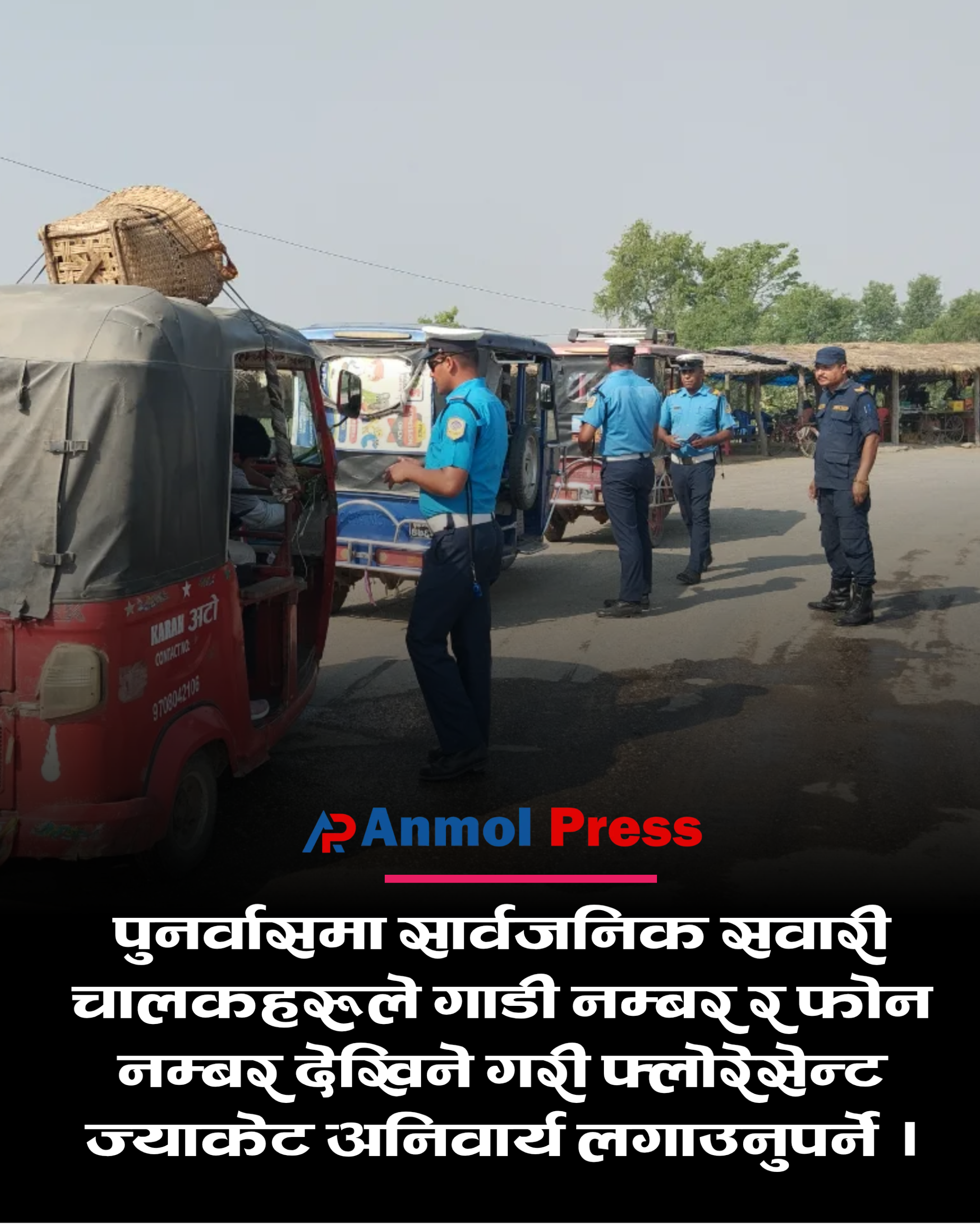 अबदेखि यहाँका अटो, ट्याक्सी तथा विद्युतीय रिक्सा चालकहरूले अनिवार्य रूपमा आफ्नो गाडी नम्बर र फोन नम्बर देखिने गरी फ्लोरेसेन्ट ज्याकेट अनिवार्य लगाउनुपर्ने नियम लागू गरेको अस्थायी ट्राफिक प्रहरी पोष्ट त्रिभुवन बस्तीका इन्चार्ज ट्राफिक प्रहरी वरिष्ठ हवलदार दीपक बोहराले जानकारी   दिनुभयो ।