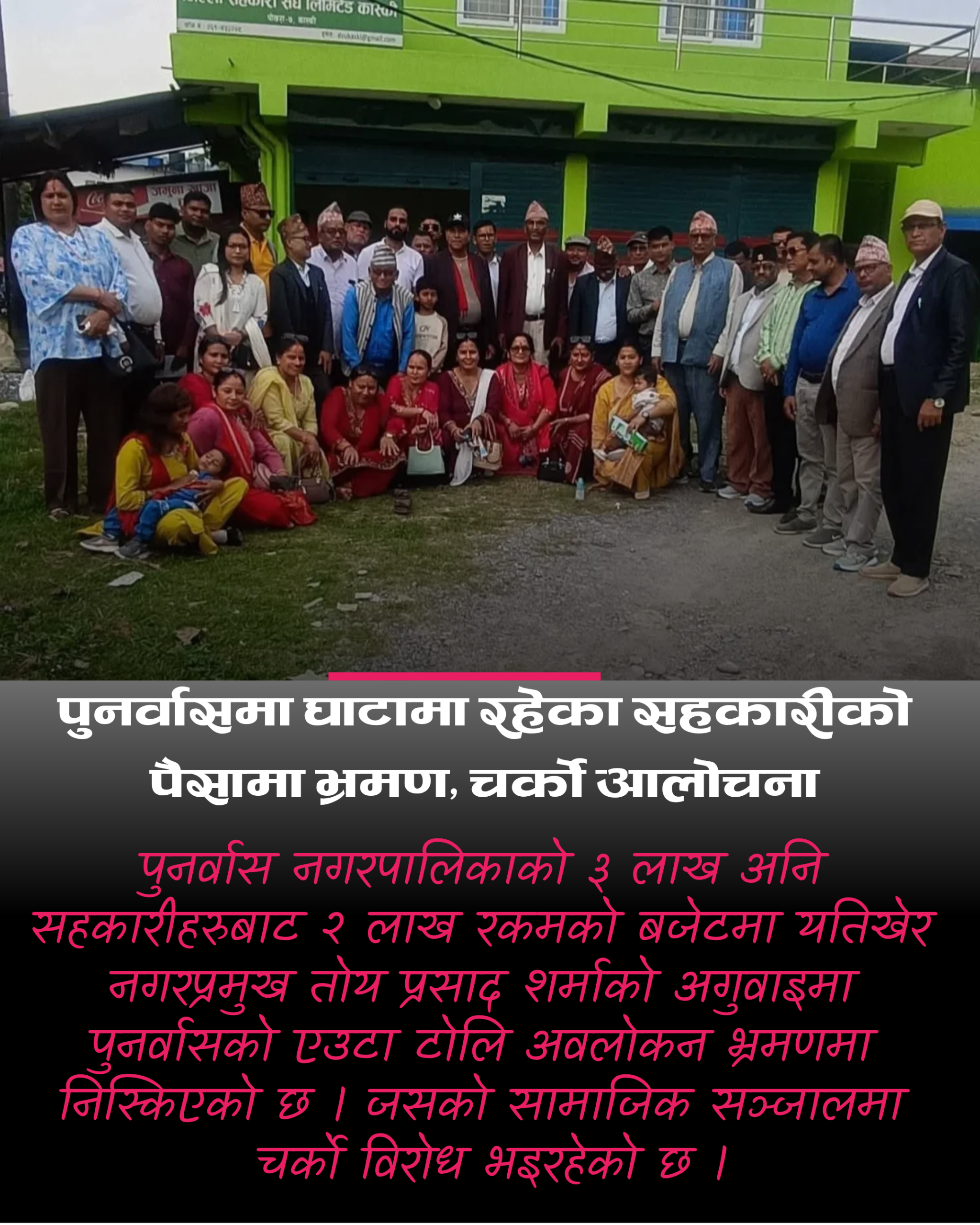 हेमन्त न्यौपाने : पुनर्वास नगरपालिकाको ३ लाख अनि सहकारीहरुबाट २ लाख रकमको बजेटमा यतिखेर नगरप्रमुख तोय प्रसाद शर्माको अगुवाइमा पुनर्वासको एउटा टोलि अवलोकन भ्रमणमा निस्किएको छ । जसको सामाजिक सञ्जालमा चर्को विरोध भइरहेको छ ।